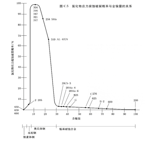 c)采用点蚀指数(PRE)更高的材料或氯化物SCC概率与含镍量关系图所示对CLSCC免疫的材料: